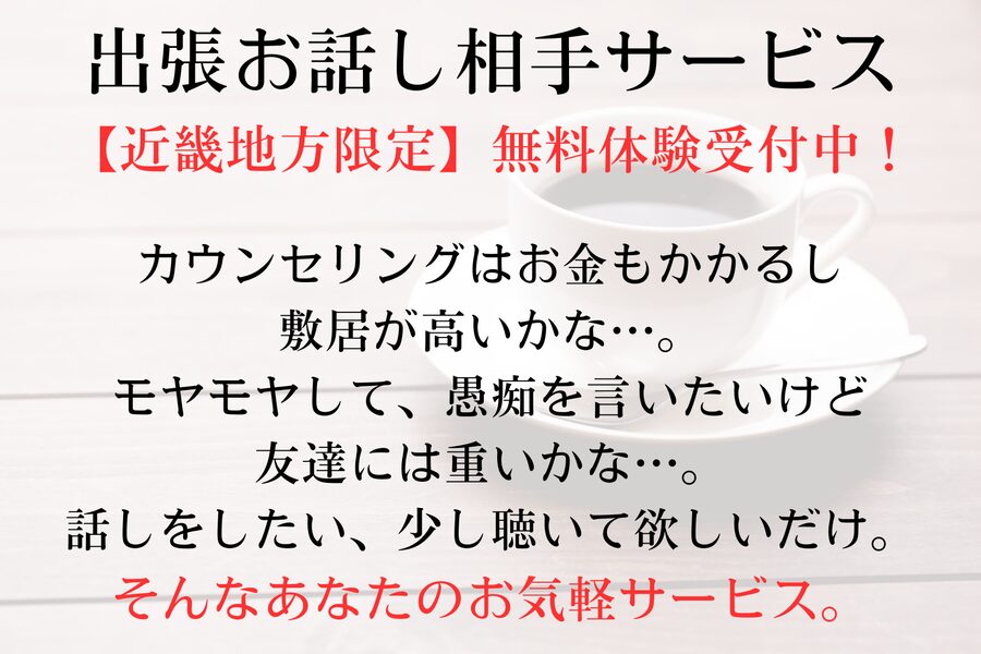 差別化に指定場所に足を運ばせて頂きお会いする、なのでサービス地域の限定を行う、有料のコンサルやカウンセリングなどの深刻な相談では無く、気軽な話し相手として、あなたの話しを聞く個人向けサービスを行ってみようと思いました。